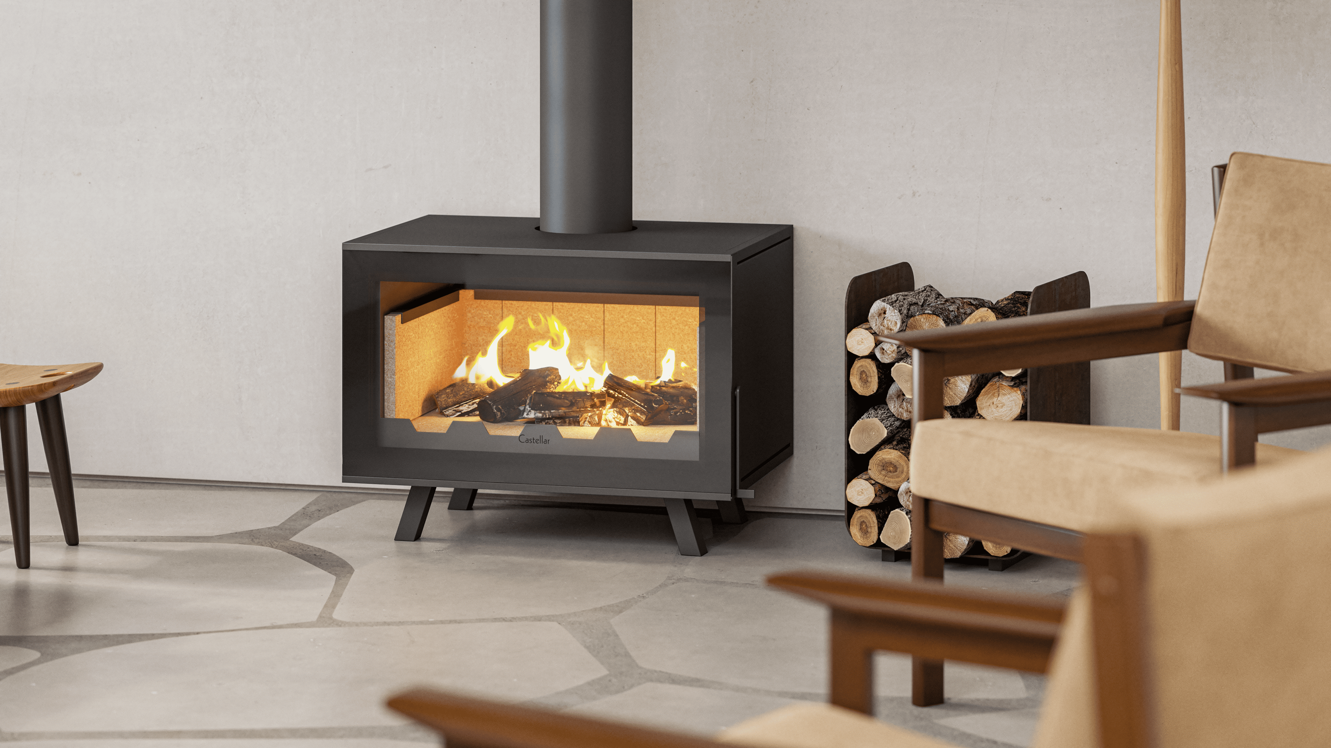 Seu vidro vitrocerâmico serigrafado reduz a visualização do metal e amplia o protagonismo das chamas, transformando o fogo em parte essencial da decoração.